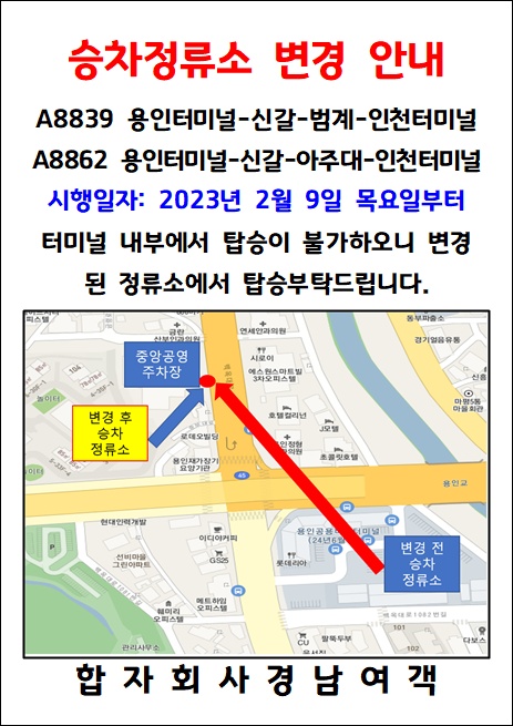 용인터미널에서 범계와 아주대를 거쳐 인천터미널로 가는 버스도 아래와 같이 승차정류소가 변경되었으니 사전 체크 하시기 바랍니다.