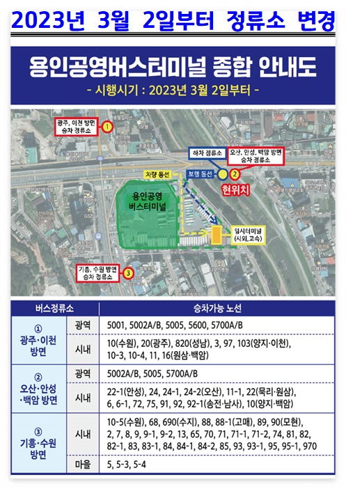 용인공용버스터미널은 2023.3.2일부터 정류소가 변경되었습니다. 아래 버스 노선별 위치 잘 확인하셔서 승차하시는데 불편함 없으시도록 체크하시기 바랍니다.