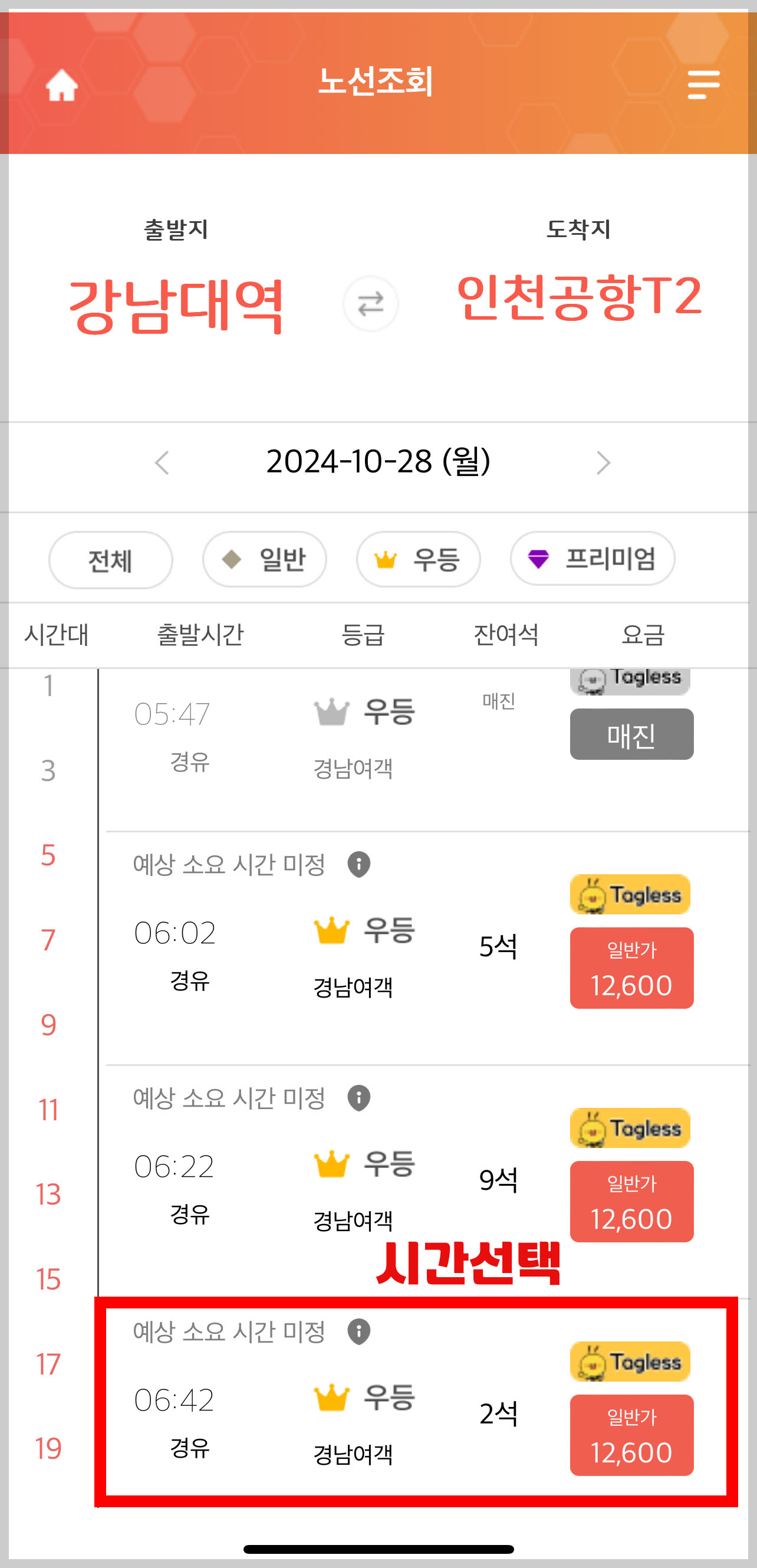 3. 비행기 출발 시간에 맞춰 여유있게 버스 시간을 선택합니다.늦에 예매하실 경우 원하시는 시간대 버스가 매진될 수 있으니 여유있게 예매를 해주셔야 합니다. 보통 2주전부터 인천공항 버스를 예약하실 수 있습니다.