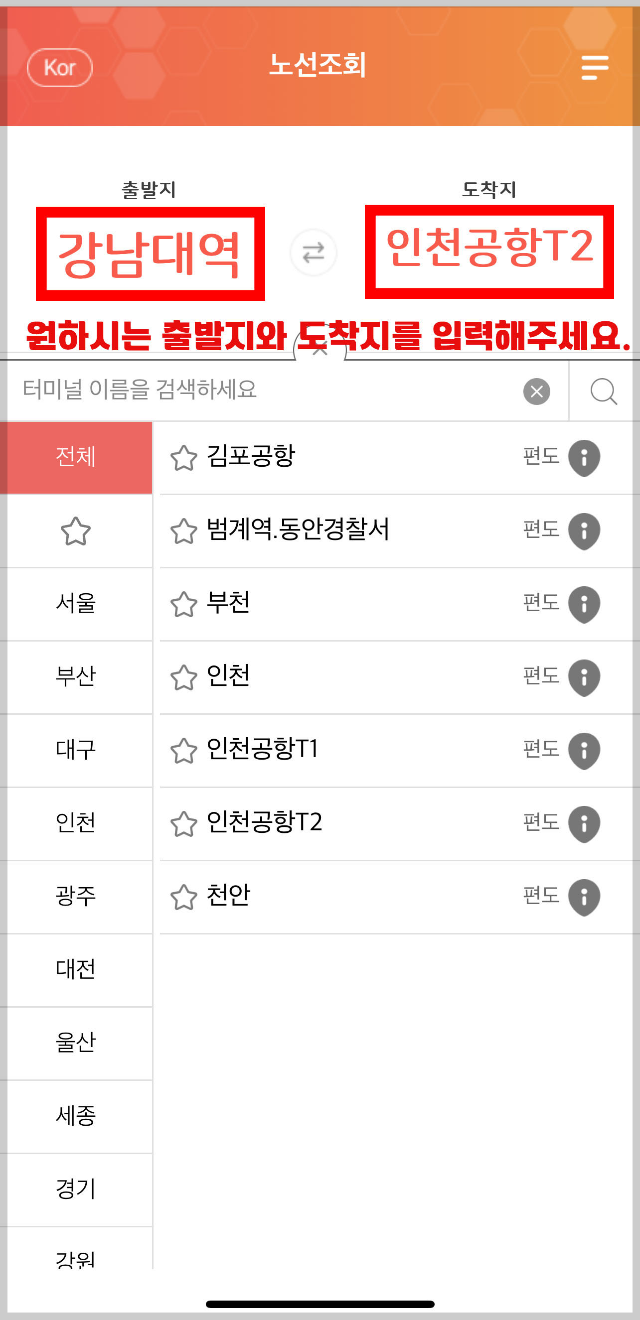 2.아래와 같이 원하시는 출발지와 인천공항 터미널 T1,T2 를 확인하셔서 입력해주세요. 티켓을 통해 정확한 인천공항 터미널1,2인지를 확인하시기 바랍니다.