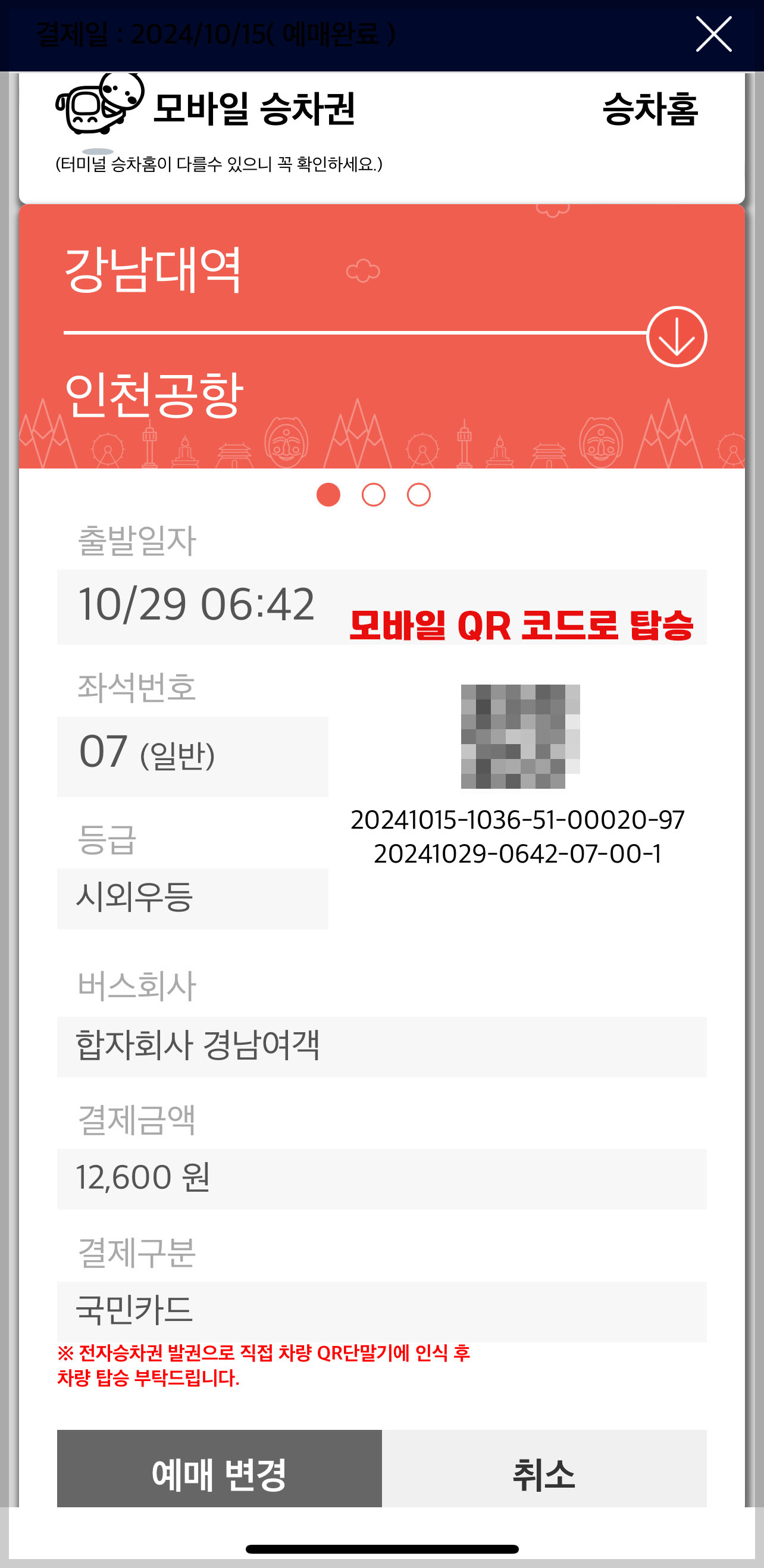 6. 아래와 같이 모바일 승차권이 보여지며 모바일 승차원긘 qr코드로 버스에 탑승하시면됩니다. 버스 카드 태그하는 단말기에 바코드 인식하는 부분에 큐알 코드를 스캔하시면 됩니다.