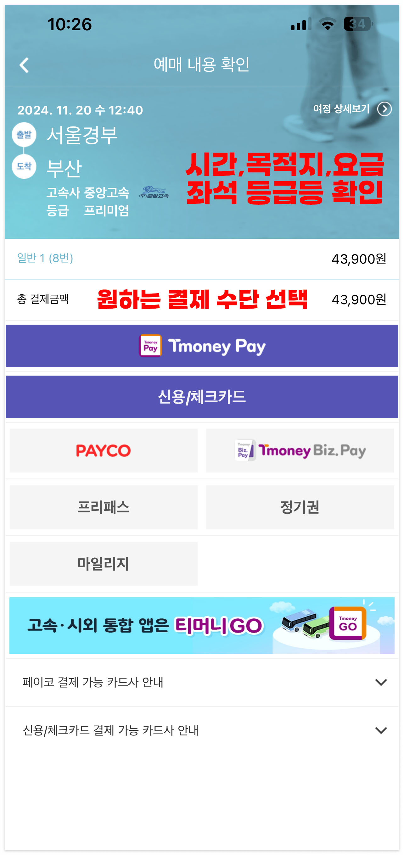 6) 최종 결제화면으로 이동하면 목적지/날짜/시간/요금등을 다시 한번 재확인하시고 원하시는 결제방법 (카드결제 또는 계좌이체)를 선택하셔서 '결제하기'를 클릭하시면 예매가 완료됩니다.