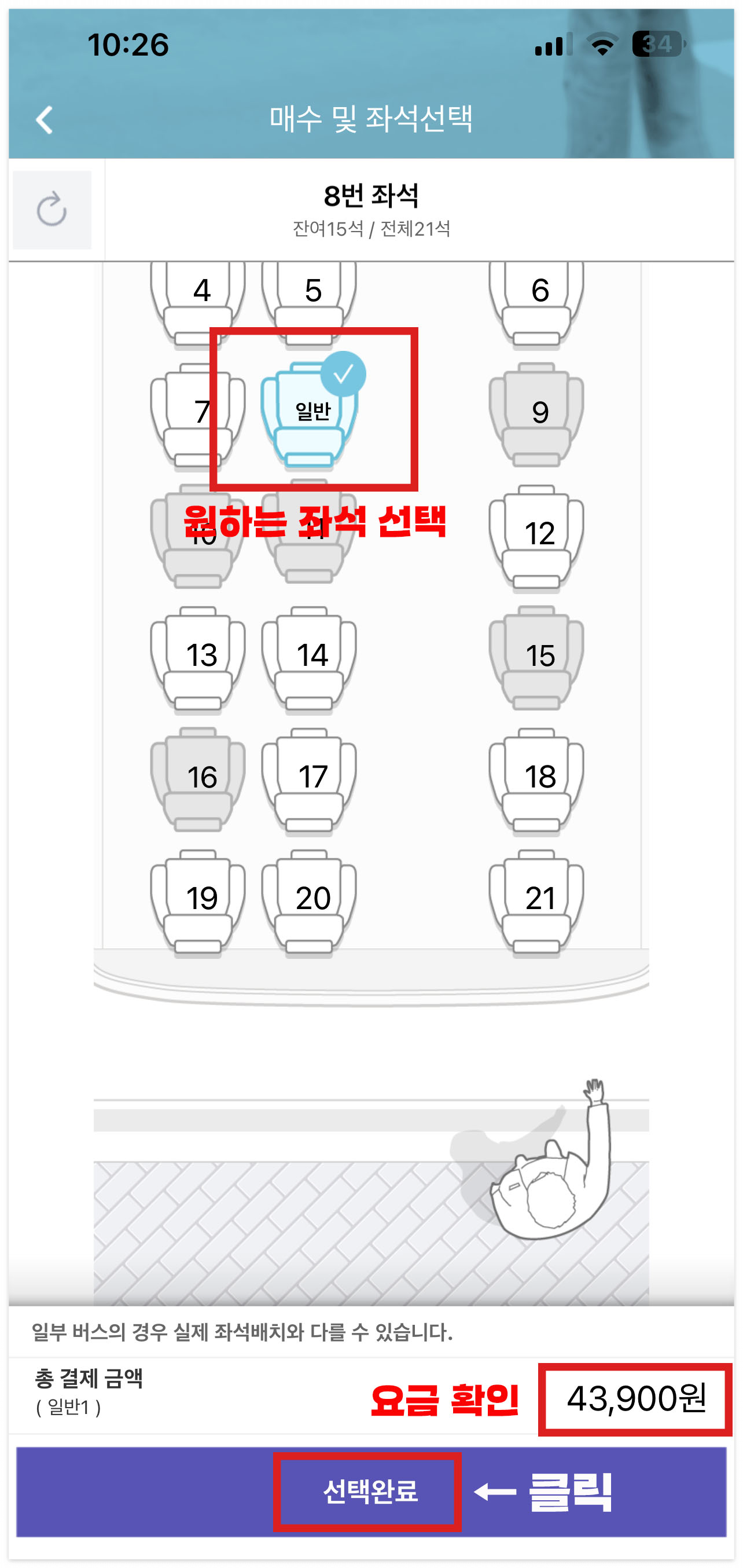 3) 예매 원하시는 티켓수를 설정하시고 원하시는 좌석을 선택 후 최종 버스 요금을 확인합니다.