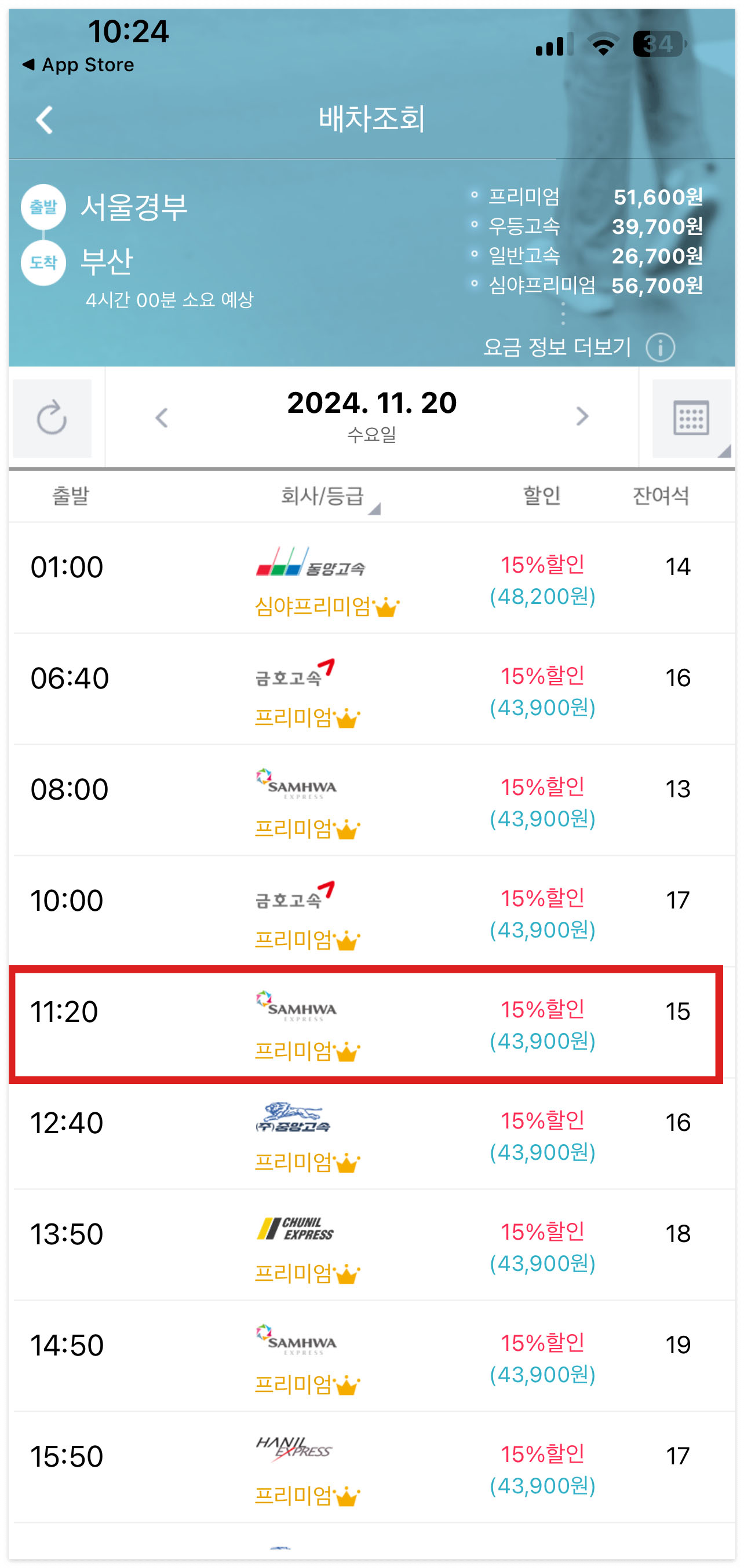 4️⃣ 아래와 같이 해당 목적지로 가는 버스의 종류와 시간대, 요금, 남은 좌석수 등을 모두 확인하실 수 있습니다.