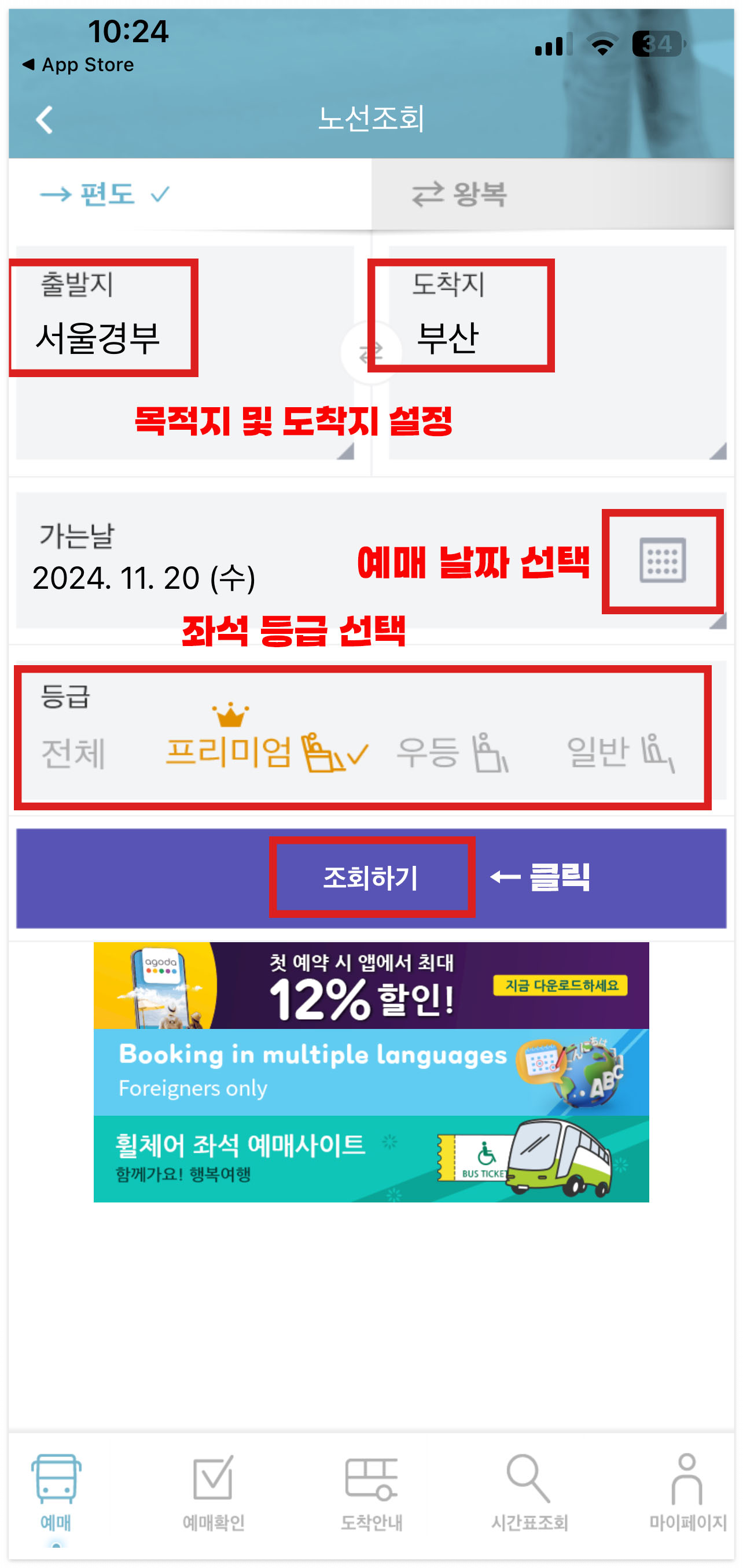 2️⃣ 출발지와 도착지를 선택하신 후 좌석 등급을 선택하여 주세요.