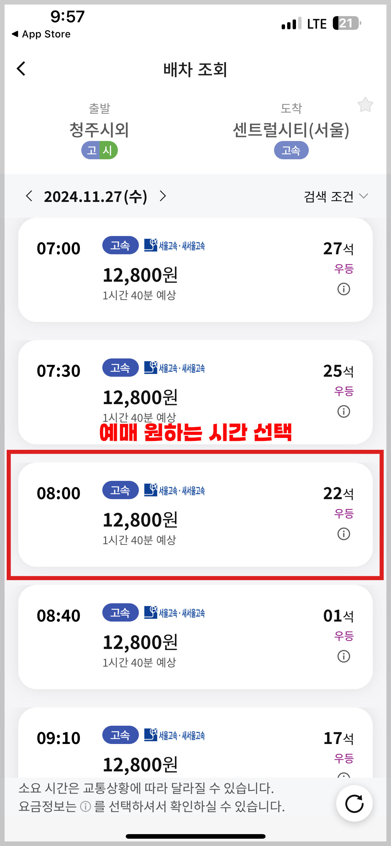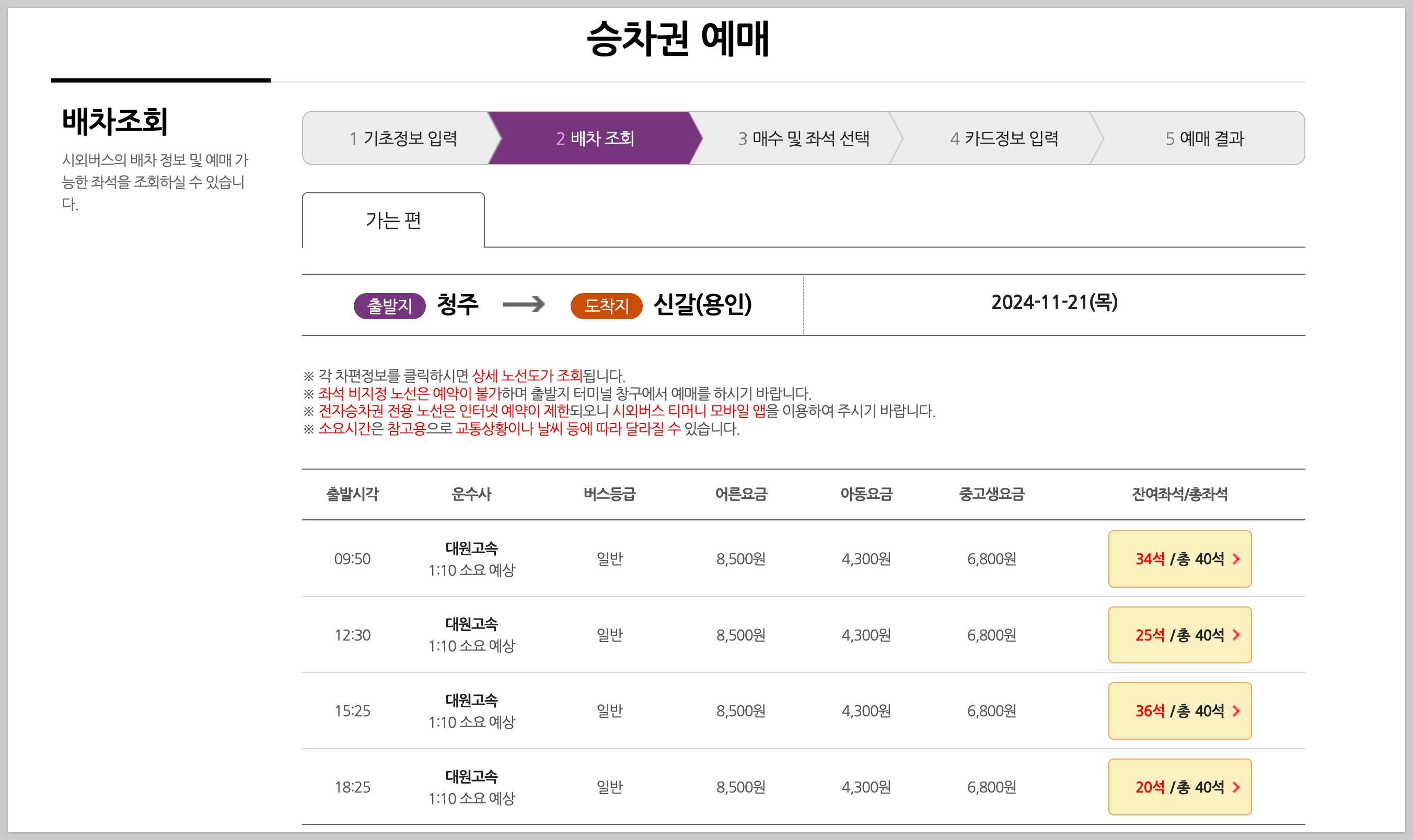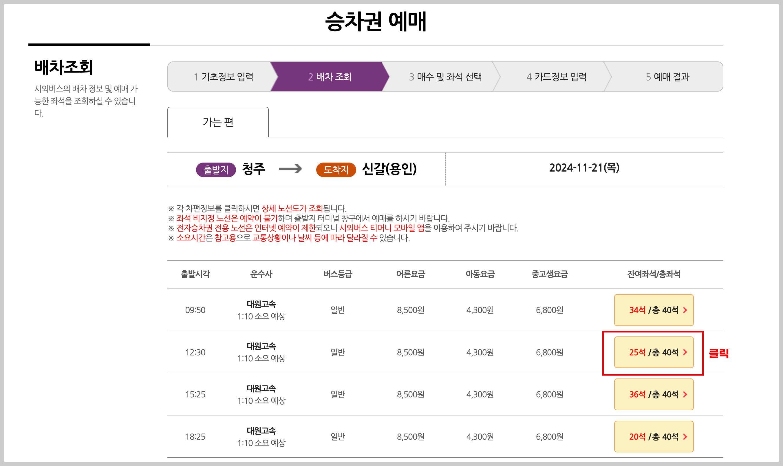 6) 예매를 원하시는 시간대의 버스 시간표를 클릭합니다.