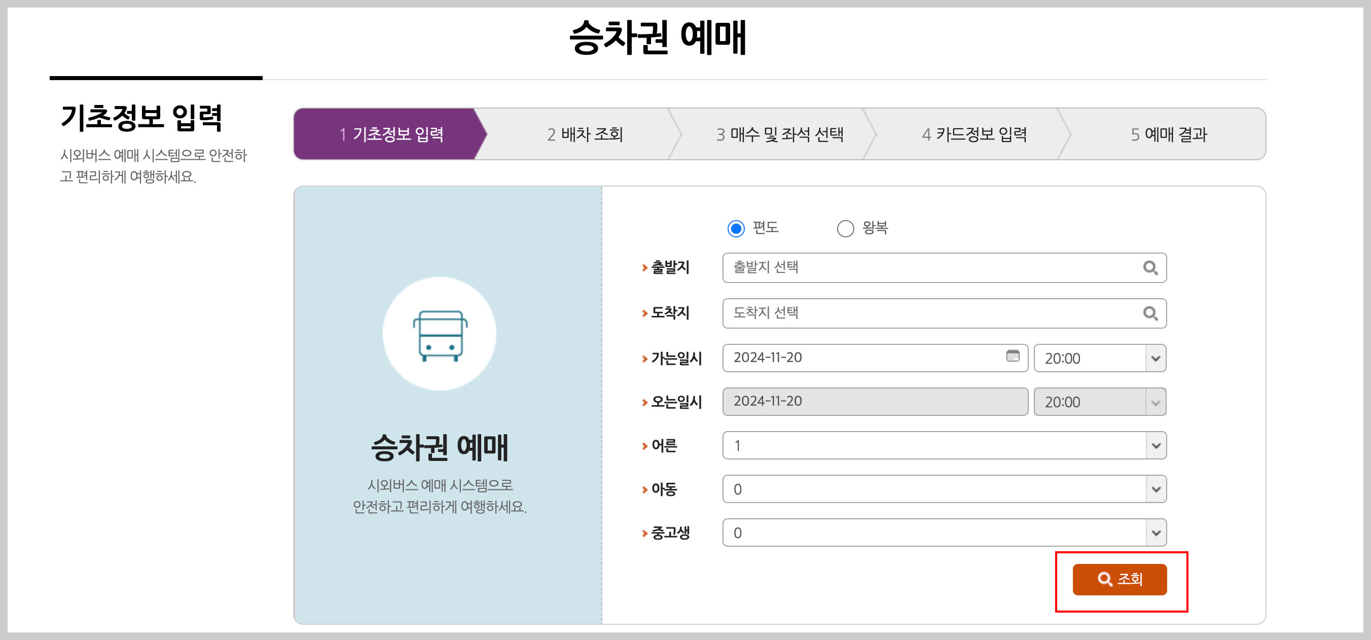 2️⃣ 조회화면에서 출발지와 목적지, 날짜, 시간을 설정하신 후 조회를 클릭합니다.