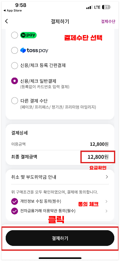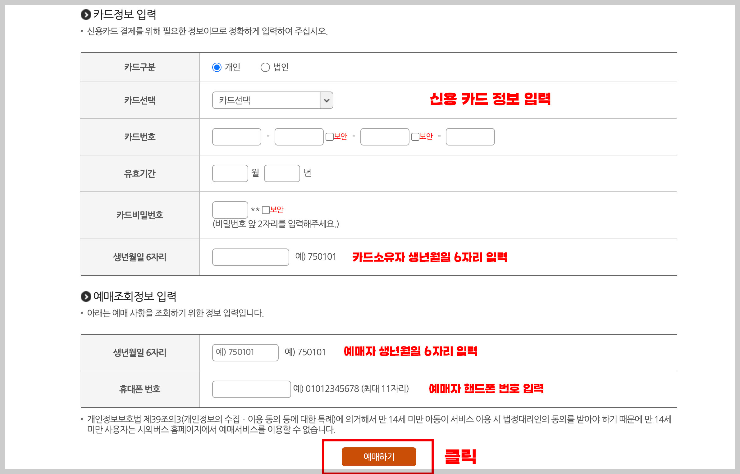3) 결제 전 단계로 다시 한번 예매 정보들 재확인하시고 이용약관에 동의하신 후 카드정보를 입력 후 결제하기를 클릭하시면 예매과정이 모두 마무리됩니다. 그럼 해당 예약내용을 가지고 탑승하시면 됩니다.