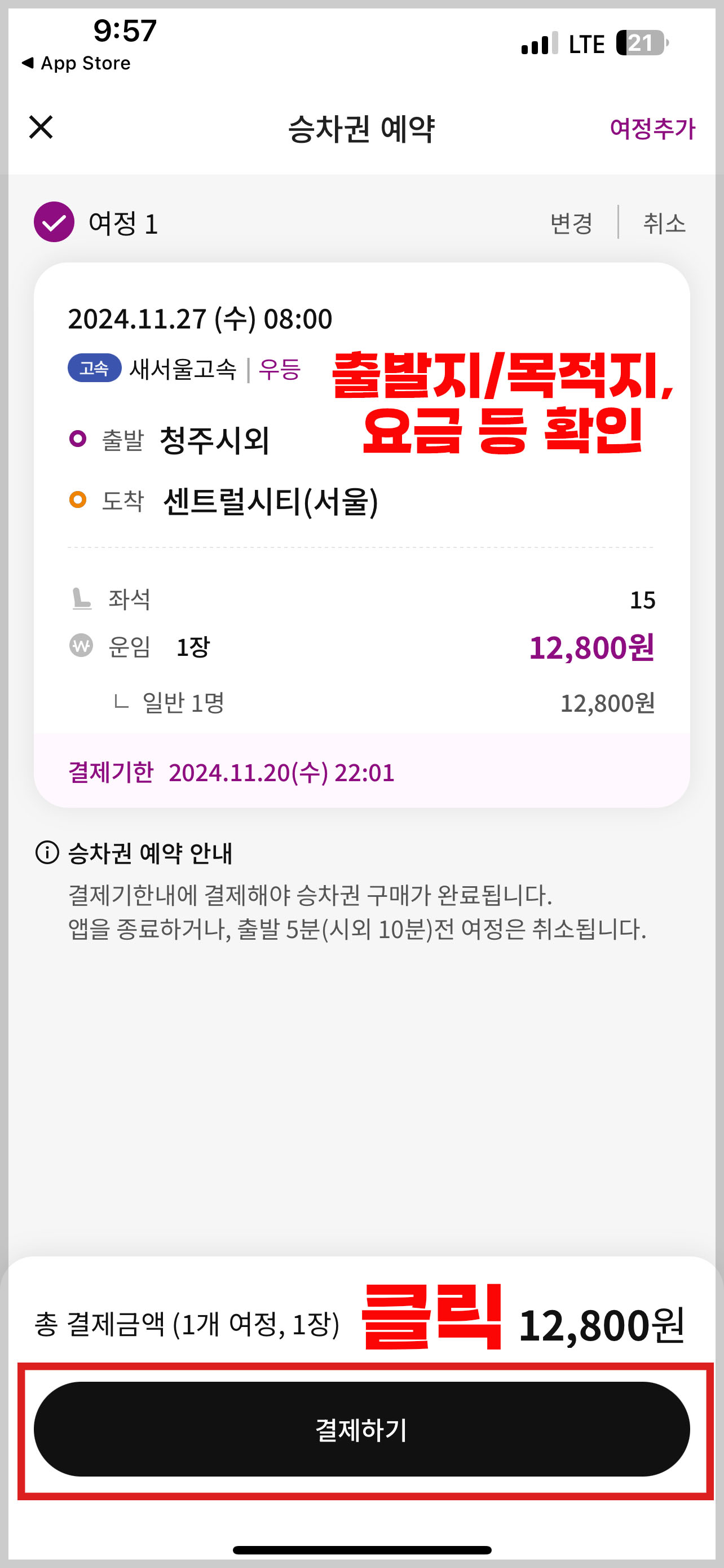 8) 결제 전 예약 정보를 다시 한번 확인합니다. 출발지/목적지/날짜/시간/매수 등 틀린 부분이 없는지 꼼꼼히 체크해 주세요.