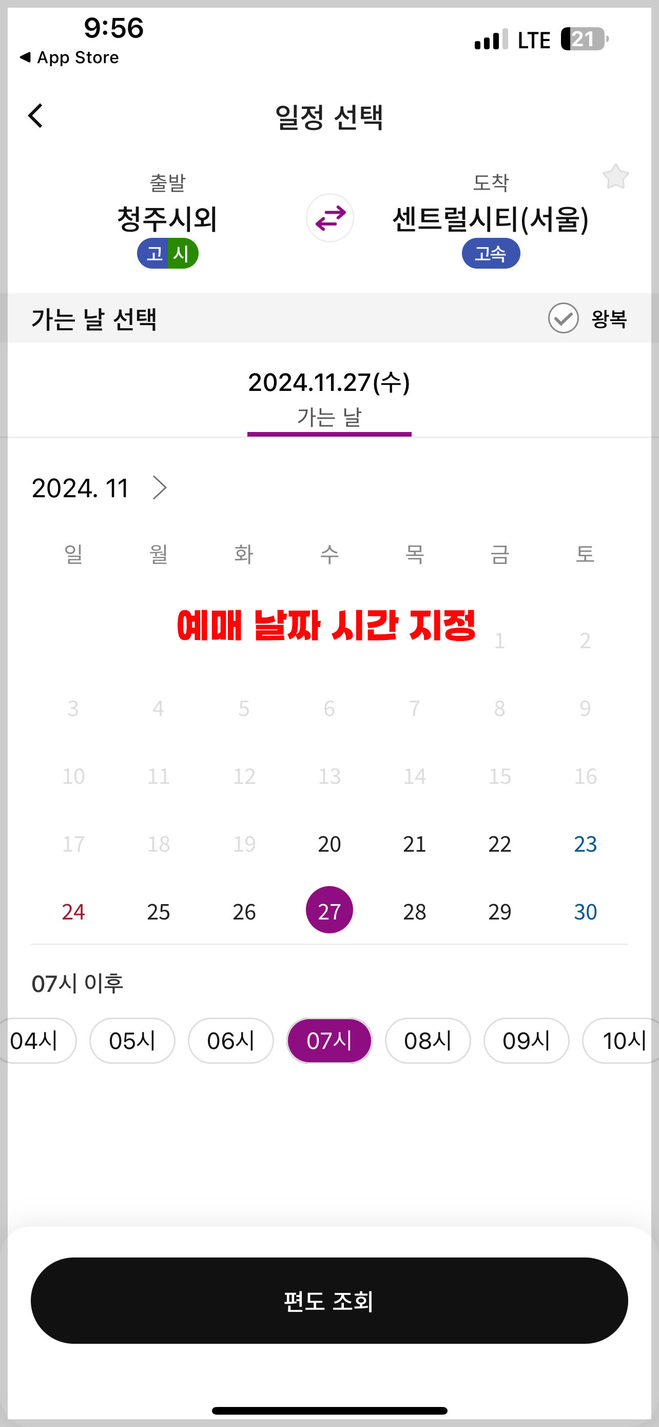 5) 도착지까지 설멍하셨다면 예매를 원하시는 날짜와 시간대를 설정 후 "편도조회"를 클릭합니다.