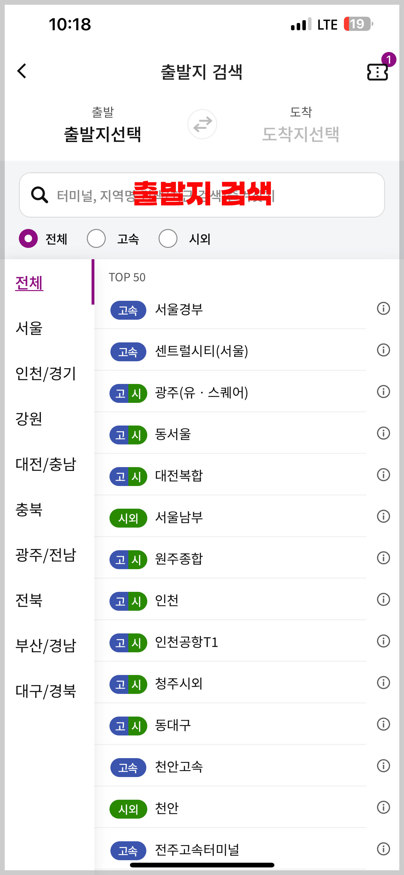 2) 검색창에 터미널명 혹은 지역명을 입력 후 돋보기 버튼을 눌러 검색을 진행합니다.