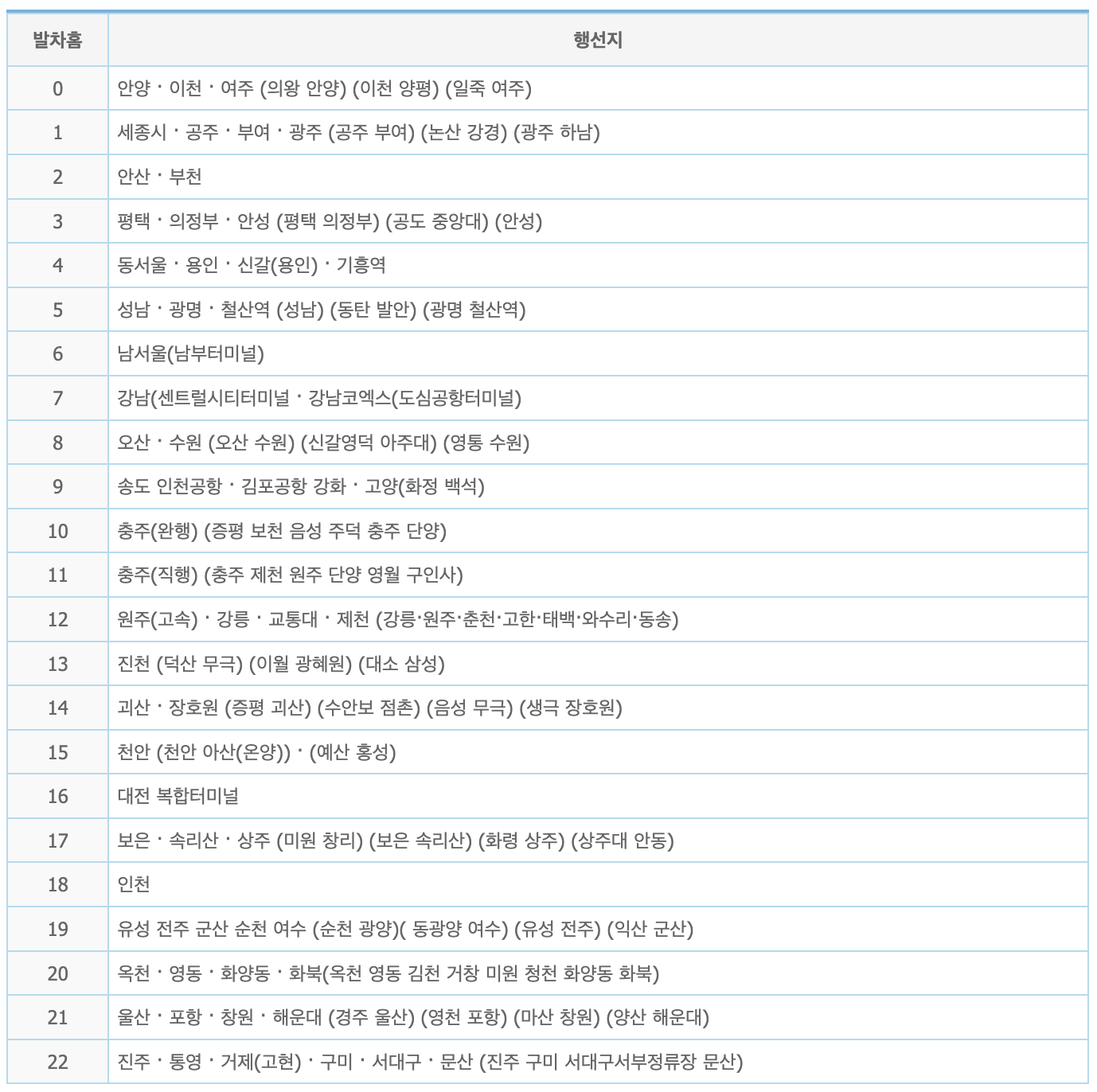 행선지별 승차홈 번호 안내입니다. 목적지의 발차홈 번호를 사전에 확인하시면 좀 더 편리한 여행이 되실 수 있습니다.